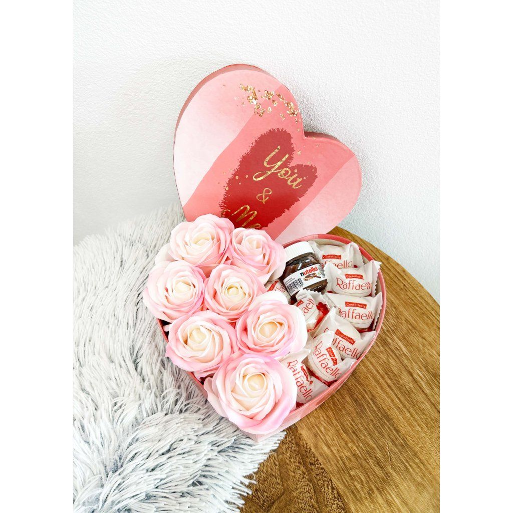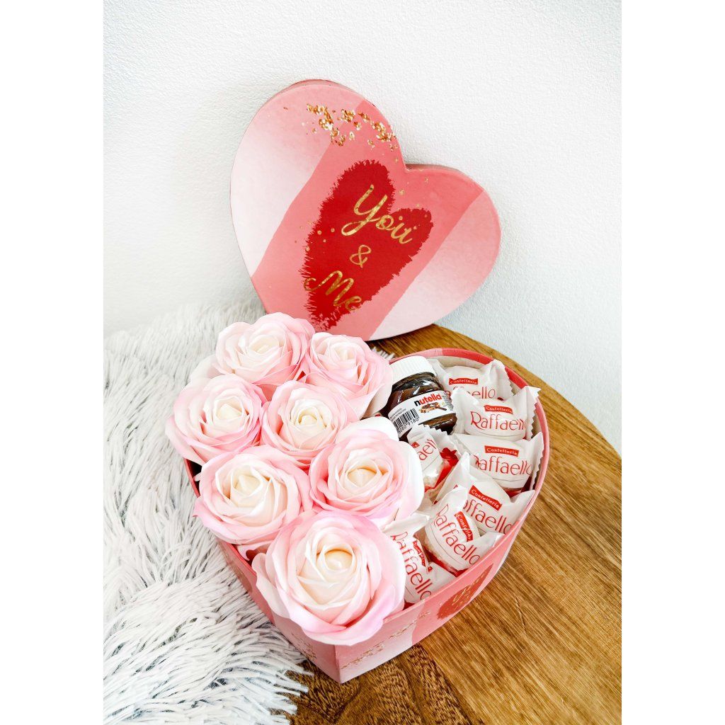 Luxusný darčekový box v tvare srdca Darčekový box srdce obsahuje: Mydlové ruže Raffaello Nutella