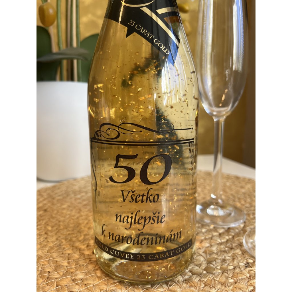 Oslava 50. narodenín si zaslúži výnimočný dar. Gold Cuvee je exkluzívne šumivé víno s 23-karátovým jedlým zlatom, ktoré spája chuť, štýl a eleganciu v jednej fľaši. Jemné biele víno v kombinácii s jemne trblietajúcimi sa lupienkami zlata vytvára luxusný zážitok pre chuť aj zrak.