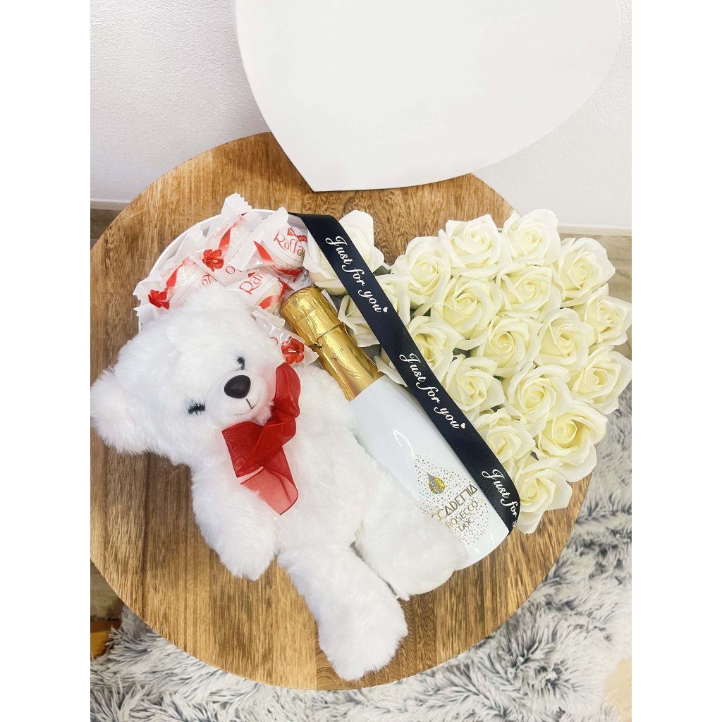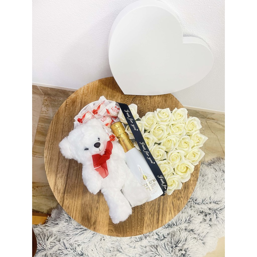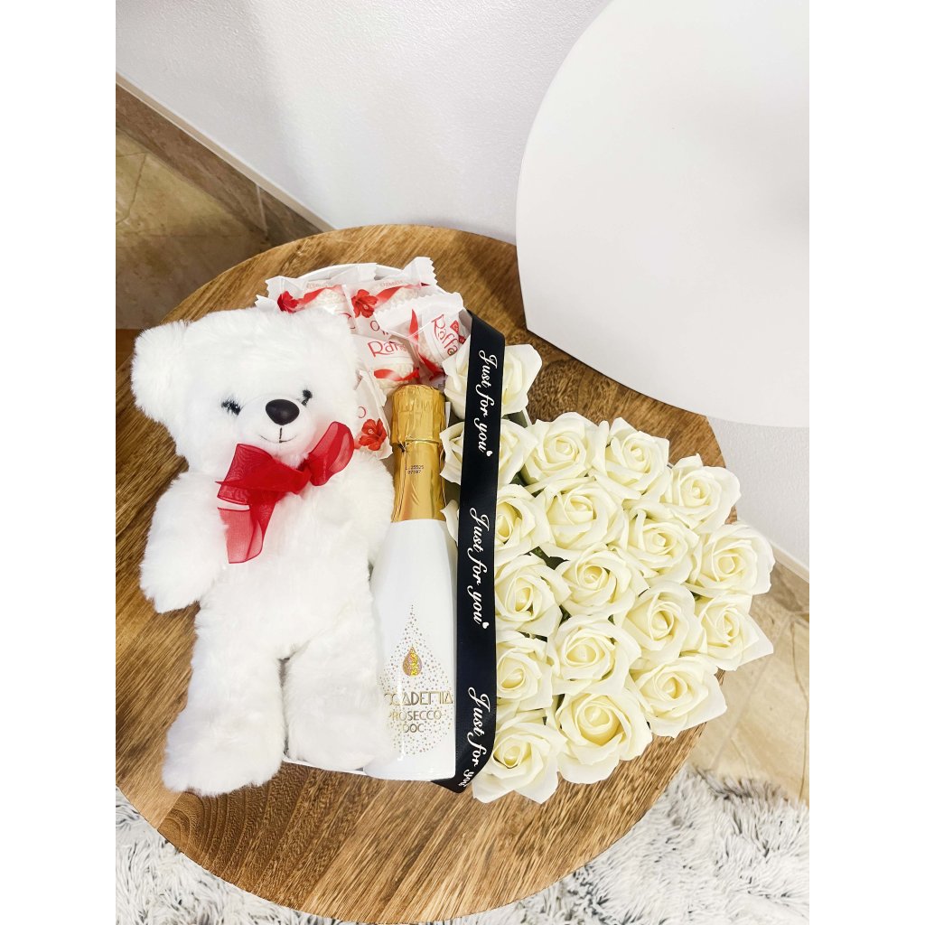 Luxusný flowerbox White Rose je štýlový darček, ktorý spája krásu, relax a chuťový zážitok. Obsahuje biele mydlové ruže určené do kúpeľa, ktoré po rozpustení jemne prevoňajú pokožku a spríjemnia chvíle oddychu. Elegantný vzhľad dopĺňa kvalitné šampanské a obľúbené čokoládové pralinky Raffaello, ktoré robia z tohto boxu skutočne výnimočný dar.