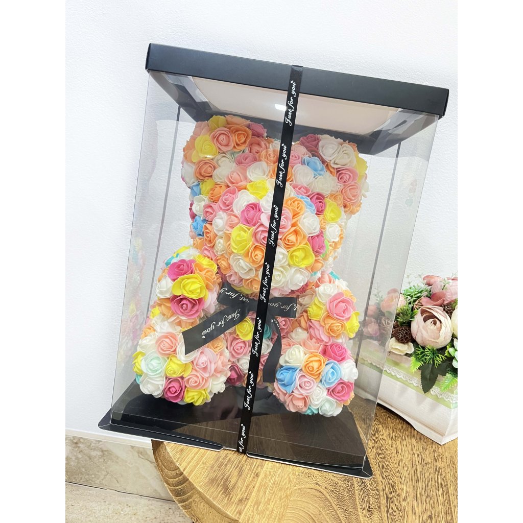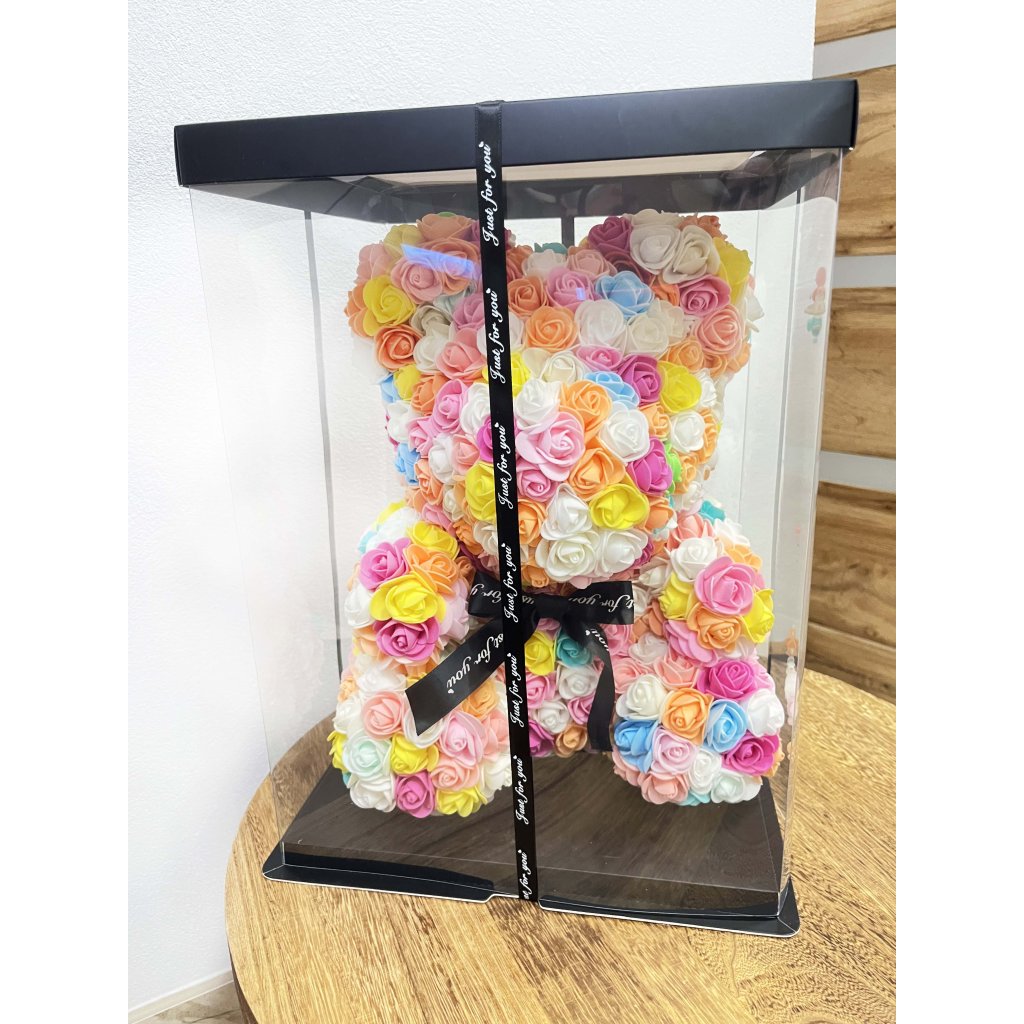 Tento krásny medvedík z penových ruží, vysoký 40 cm, je ručne vyrobený z desiatok jemných umelých ruží, ktoré nikdy nezvädnú — je tak symbolom večnej lásky, nehy a záväzku.