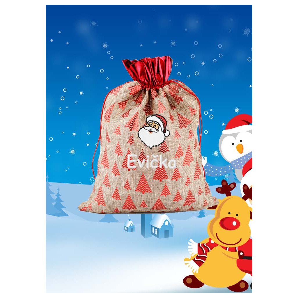 Vytvorte čarovnú mikulášsku atmosféru s naším elegantným červeným vreckom na darčeky! Vyrobené z kvalitného materiálu imitujúceho jutu, ozdobené trblietavými stromčekmi a uzatvárané saténovou šnúrkou.