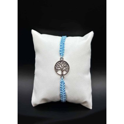 Ručne pletený náramok s motívom Stromu života v odtieni modrej, ktorý v sebe spája jemnosť a symboliku.