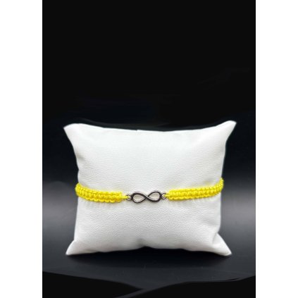 Elegantný ručne pletený náramok v žltej farbe s jemným kovovým symbolom Nekonečna.