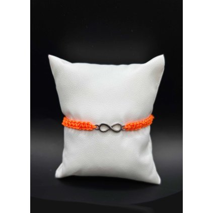 Elegantný ručne pletený náramok v oranžovej farbe s jemným kovovým symbolom Nekonečna.