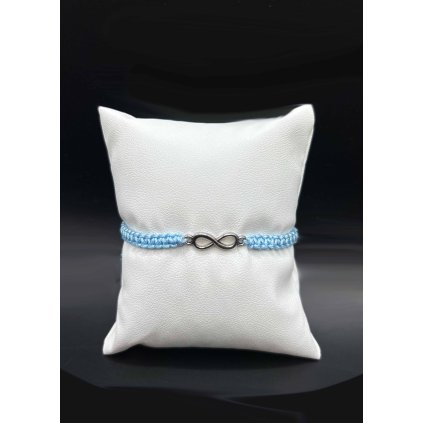 Elegantný ručne pletený náramok v modrej farbe s jemným kovovým symbolom Nekonečna.