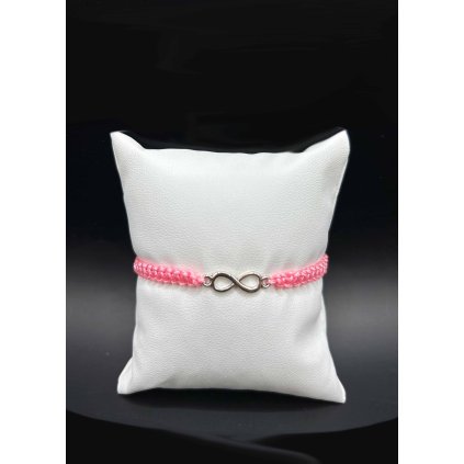 Elegantný ručne pletený náramok v bledoružovej farbe s jemným kovovým symbolom Nekonečna.