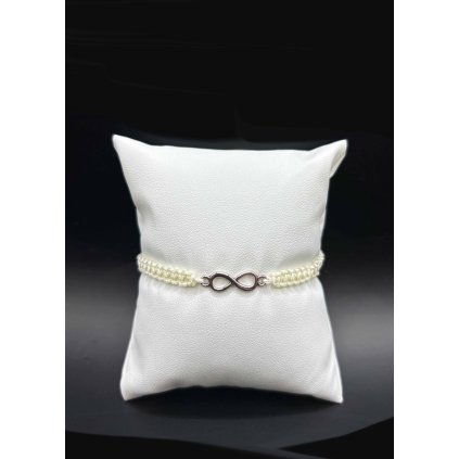 Elegantný ručne pletený náramok v béžovej farbe s jemným kovovým symbolom Nekonečna.