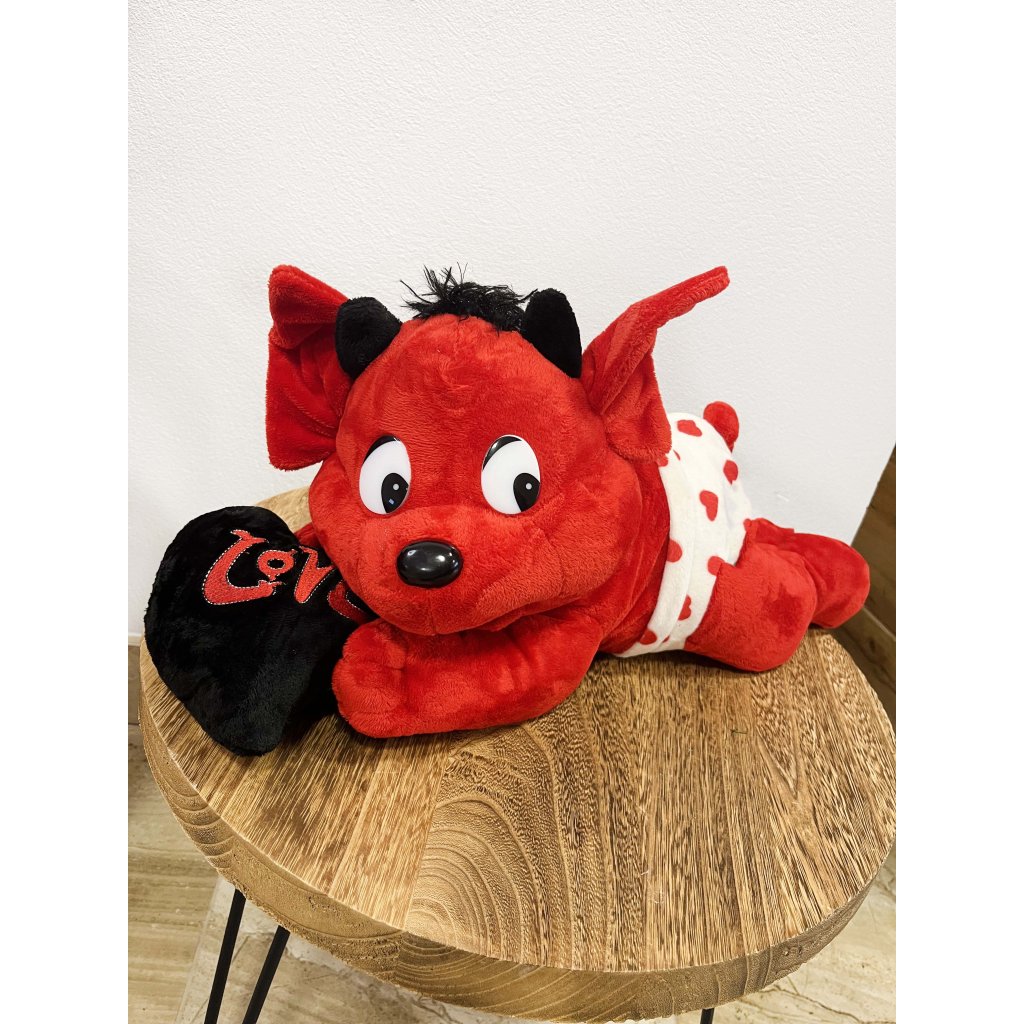 Ležiaca póza čertíka, šibalský výraz a červená farba robia z tohto medvedíka zábavnú a originálnu voľbu pre každého, kto chce darovať lásku s úsmevom.