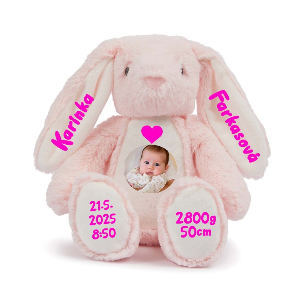 Plyšový zajačik s údajmi dieťatka a fotkou