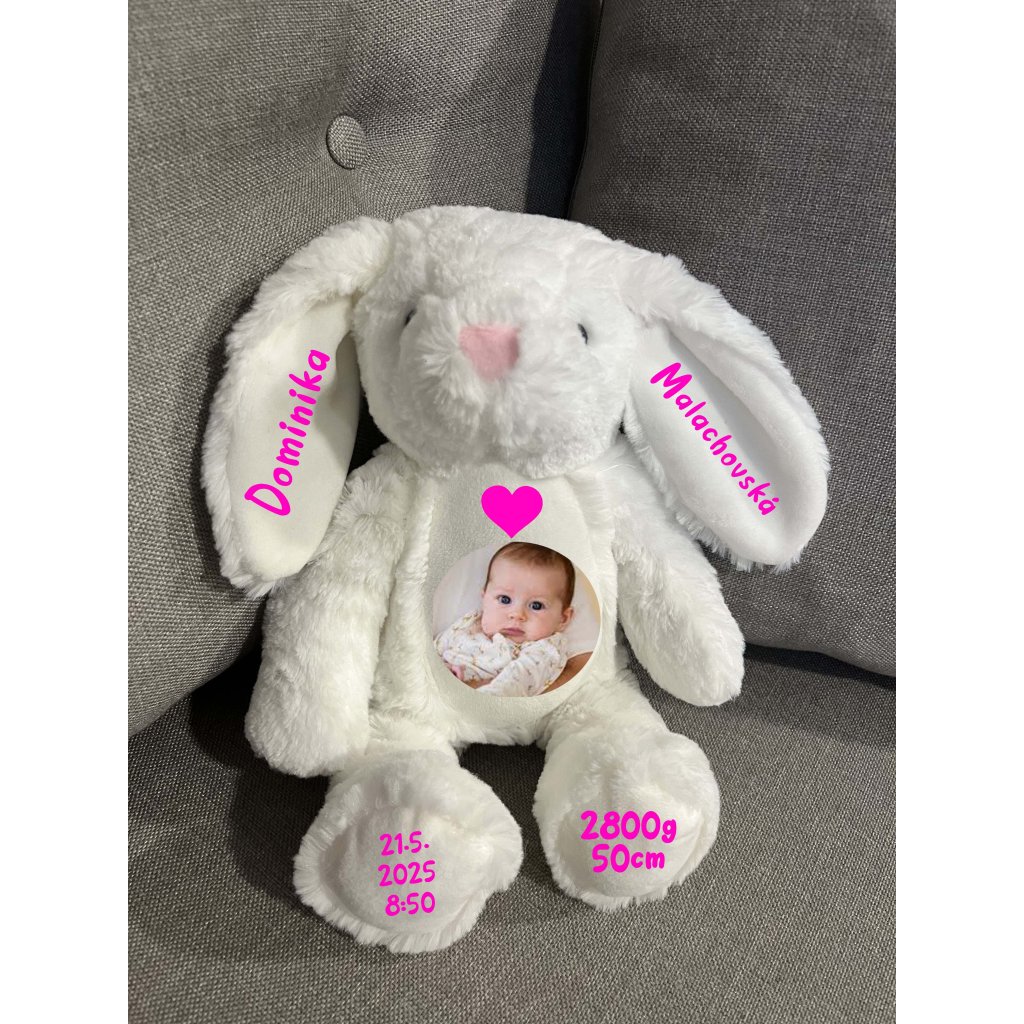 Najdojímavejším prvkom je však fotka dieťatka, ktorá je zakomponovaná tak, aby pôsobila jemne, krásne a symbolicky. Každé objatie s týmto zajačikom tak nesie spomienku na prvé chvíle, prvé úsmevy a prvé pocity, ktoré sprevádzali príchod bábätka na svet. 💞