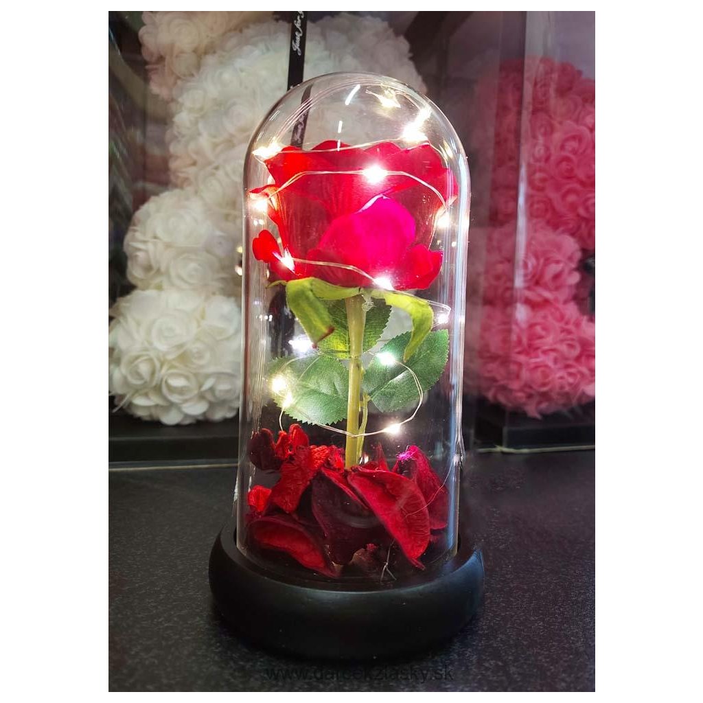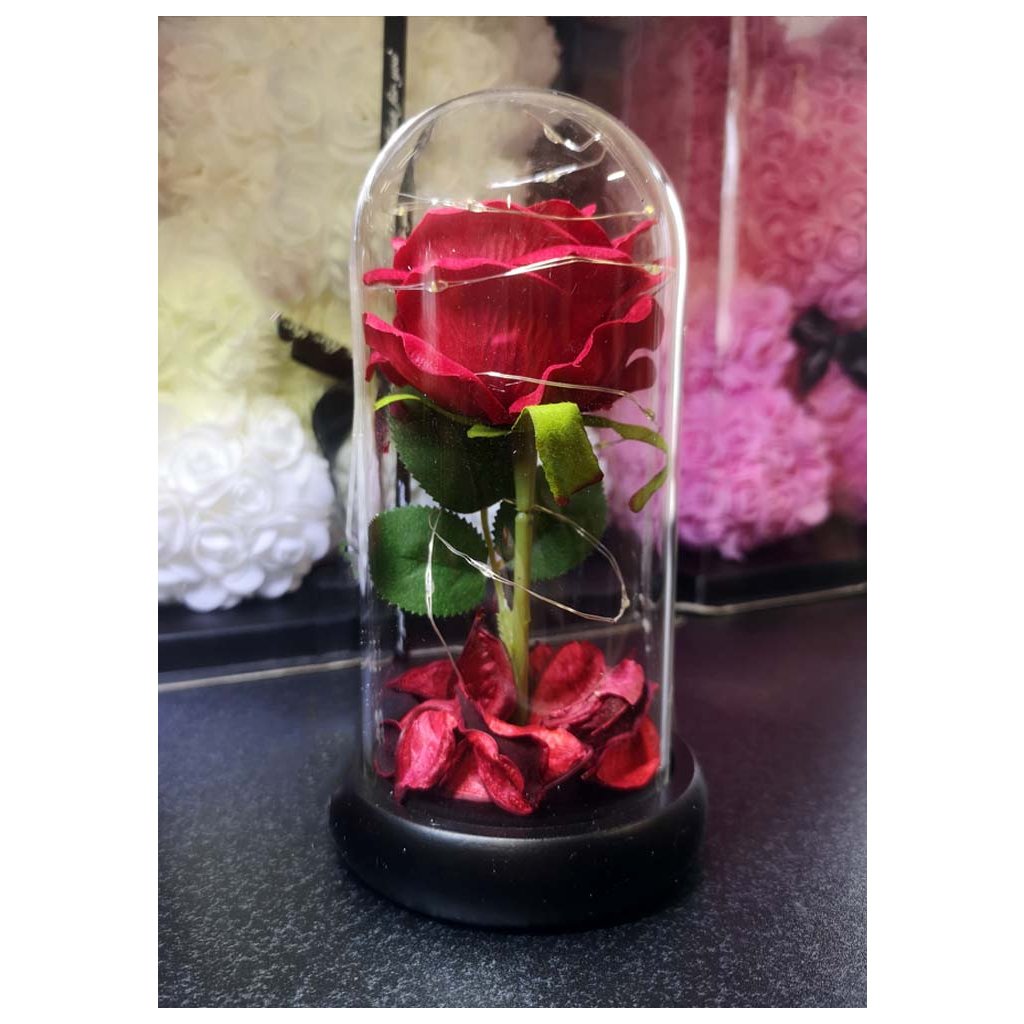 Táto ruža je ukrytá v sklenenej váze vyplnenej LED svetielkami. Z obyčajného kvetu sa tak stane romantická lampička, ktorá decentne osvieti interiér. Ruža bude zdobiť každú miestnosť ešte dlho, nikdy totiž nezvädne a rovnako tak ani spomienka na vás. Ruža sa bude vynímať na poličke s ďalšími dekoráciami, na nočnom stolíku alebo napríklad na komode.