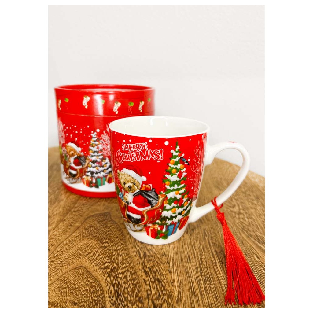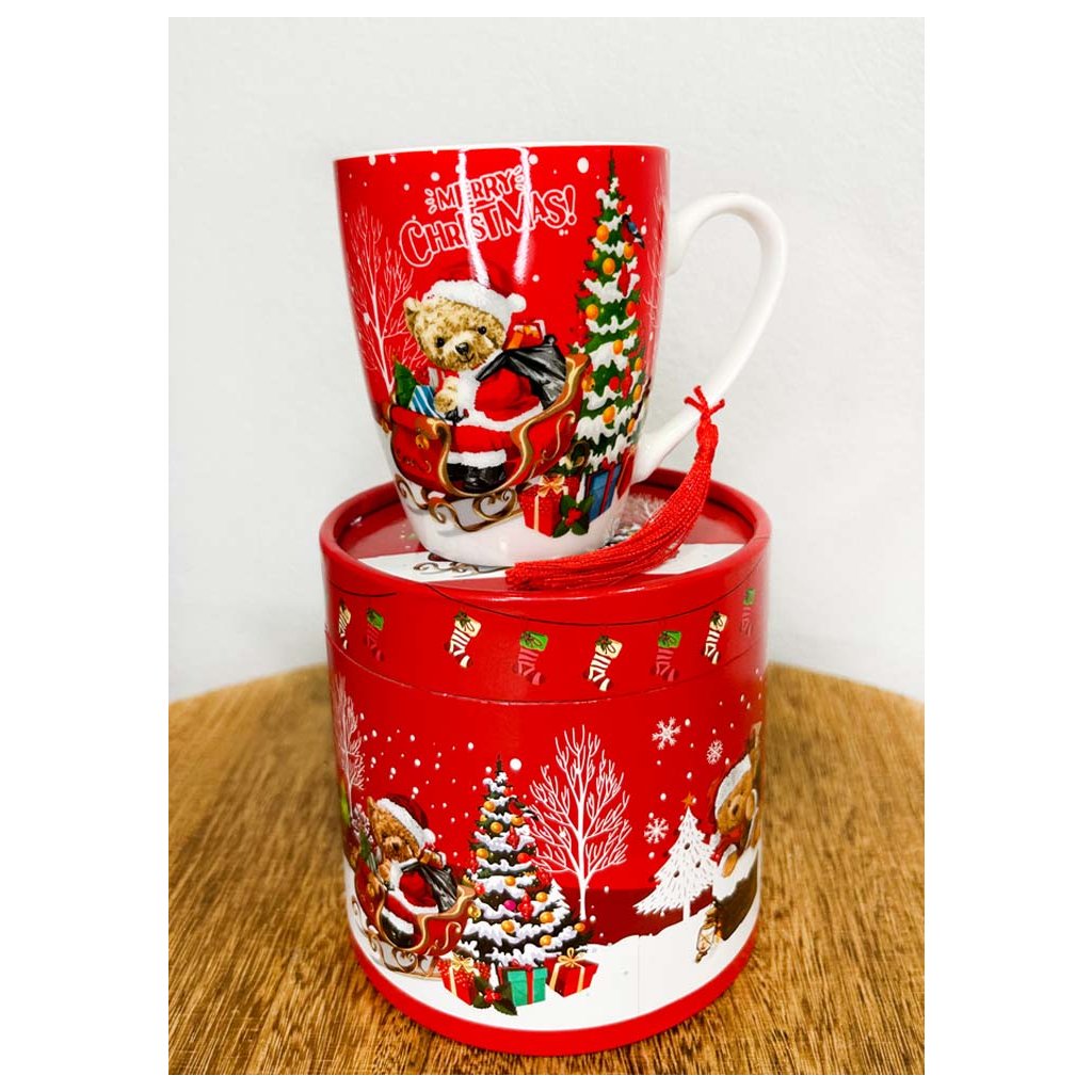 Vianočný hrnček červený v krabici Macko
