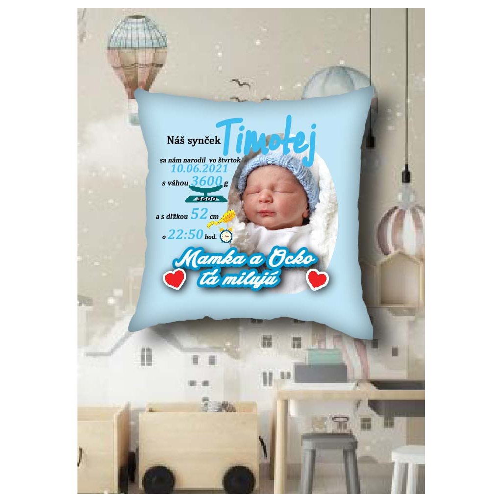 Saténový vankúš s dizajnom , s fotkou a údajmi vášho dieťatka.